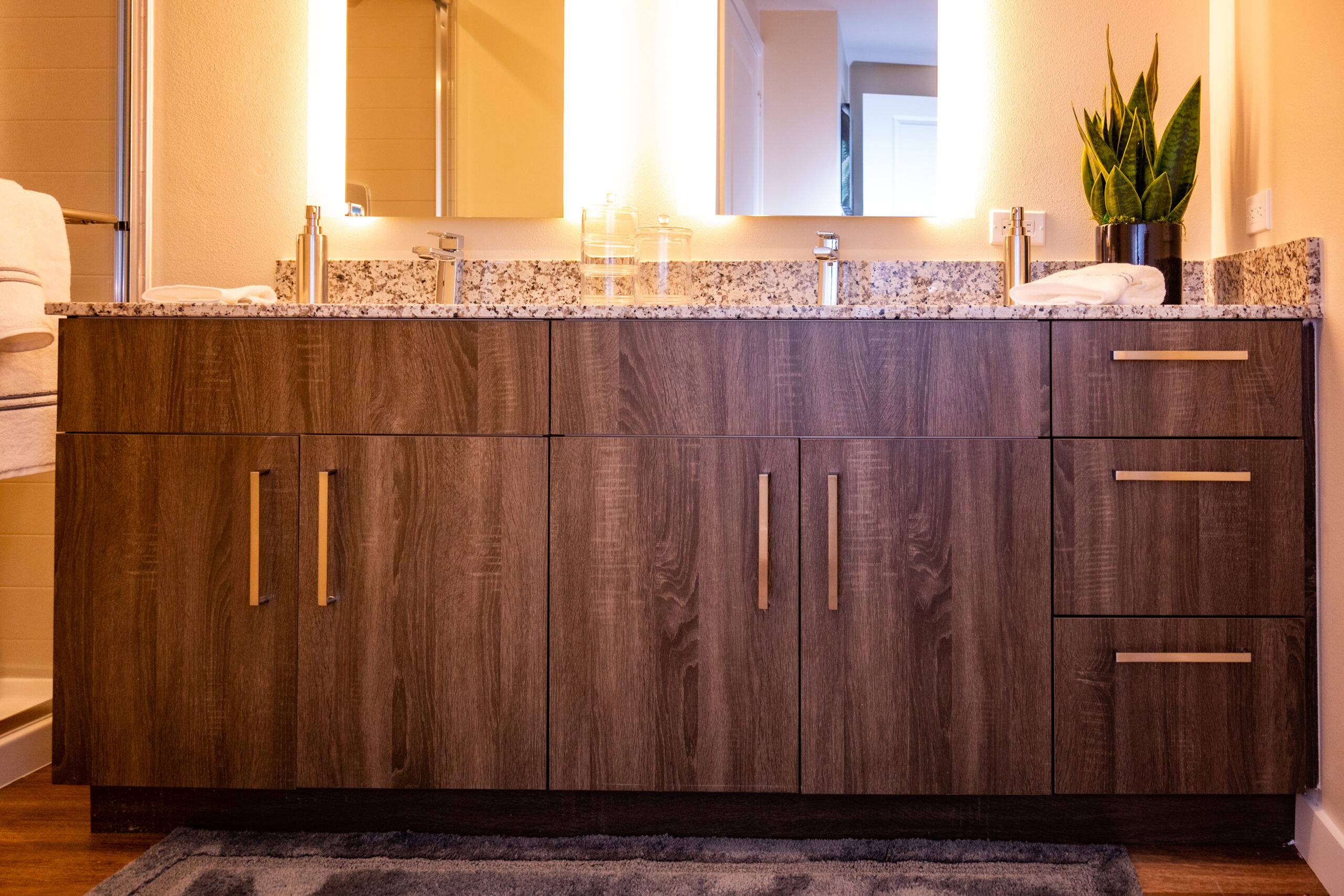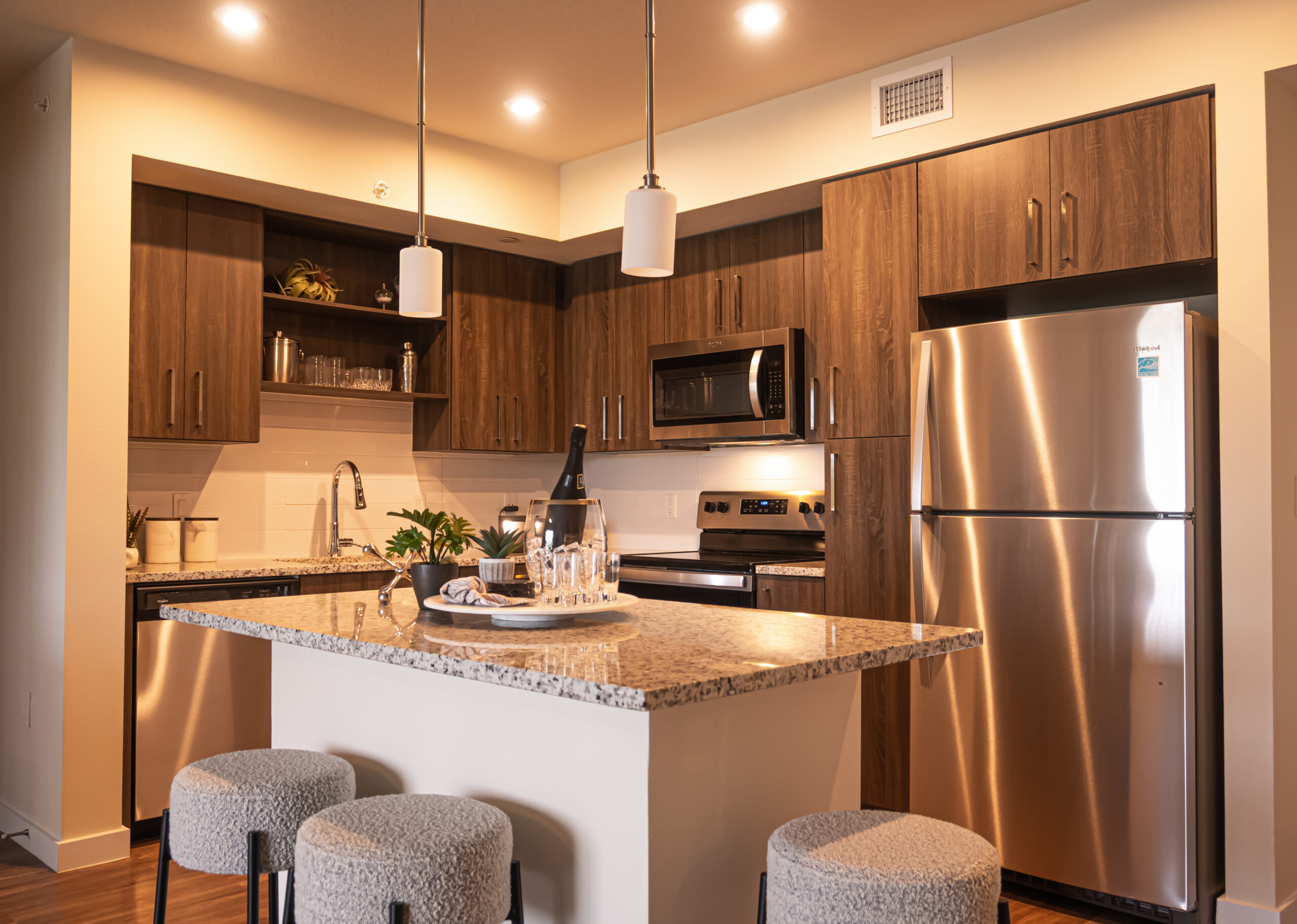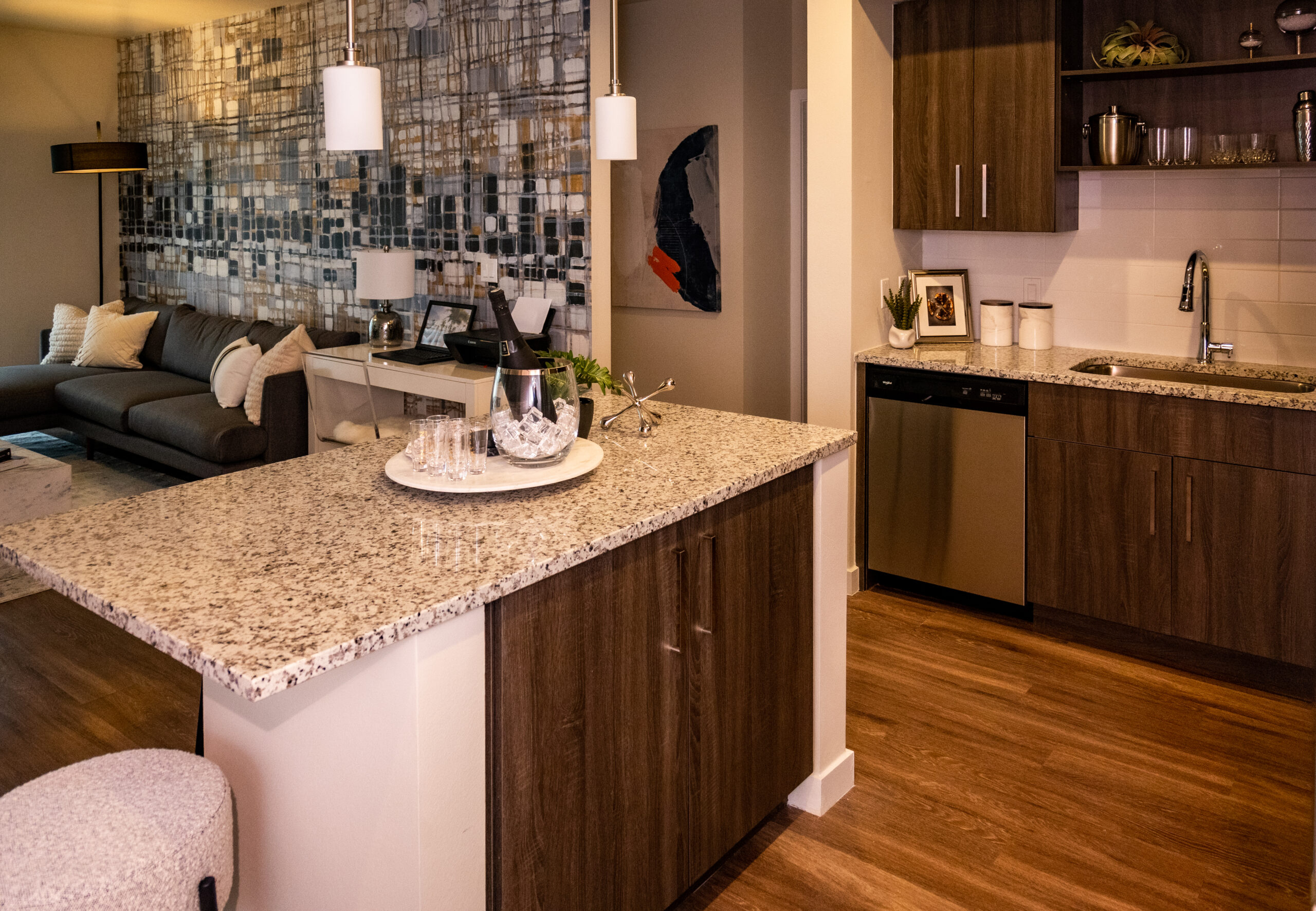 The scope of work for this project included the fabrication and installation of residential cabinetry across all apartment units. The cabinetry features a modern, flat-panel door style with a warm wood-grain finish, contributing to a contemporary yet inviting interior aesthetic. The cabinetry design supports efficient layouts while maintaining durability and performance suitable for a high-density residential environment.