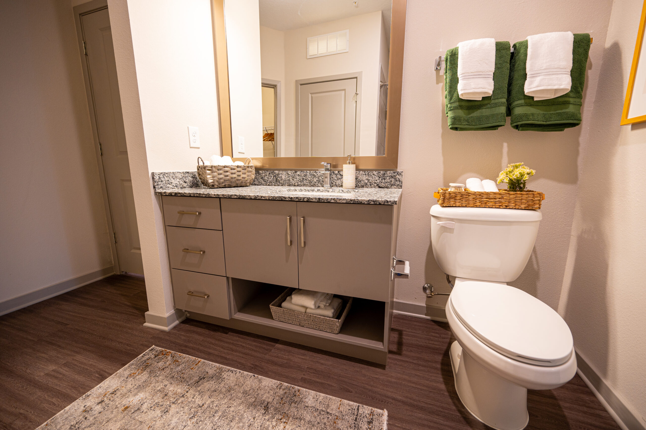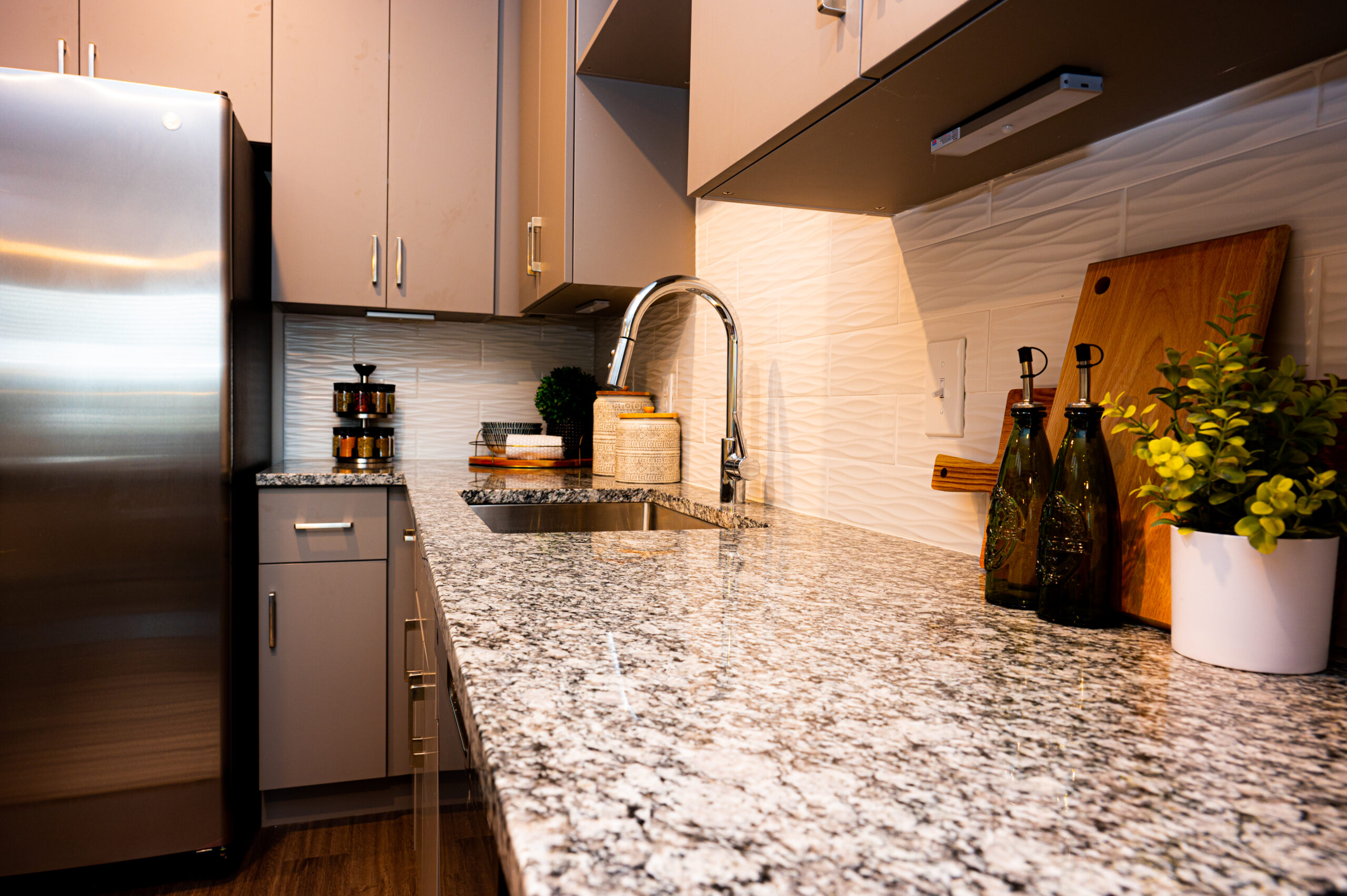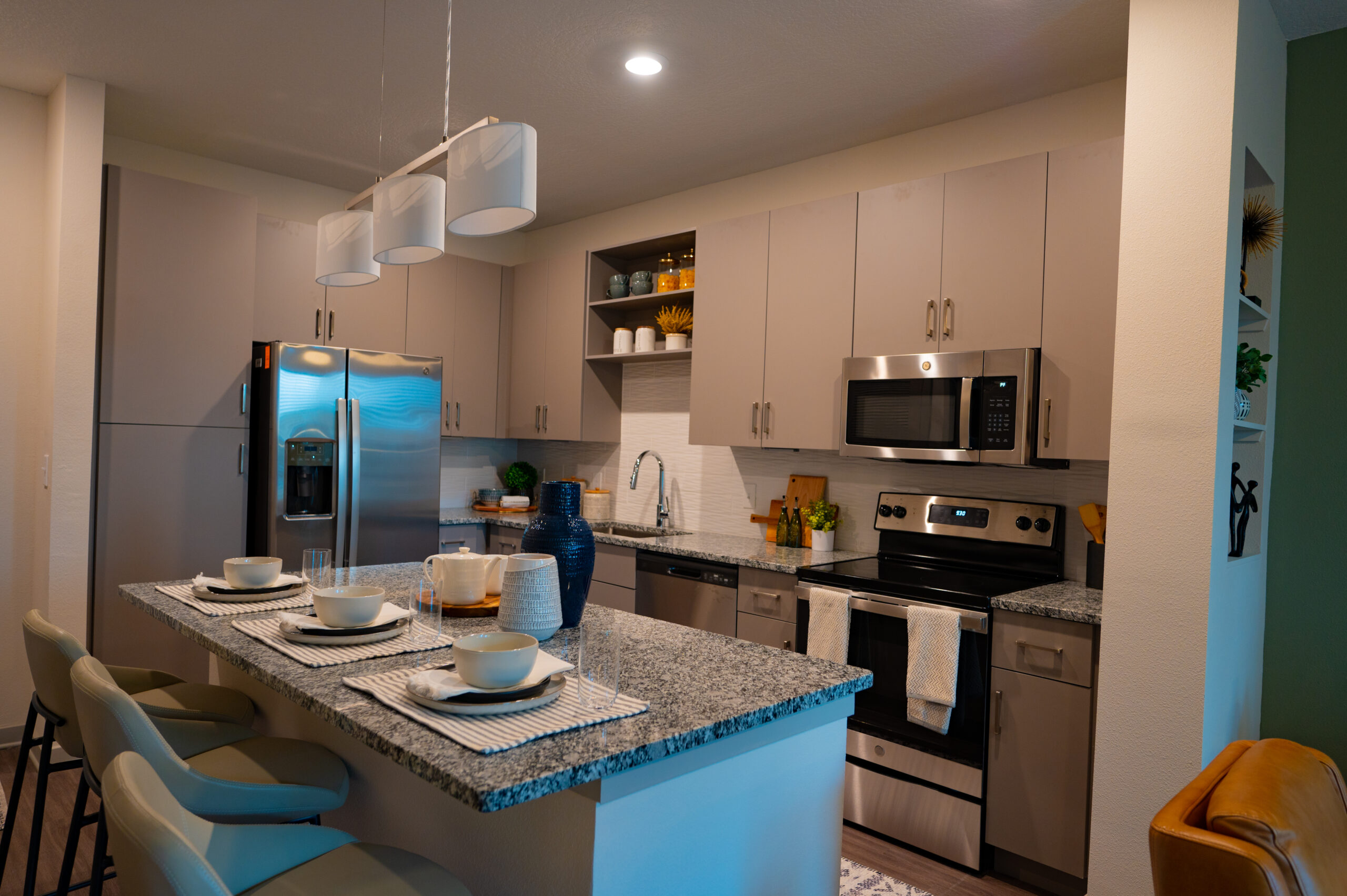 Kitchens and bathroom vanities throughout the community feature stone surfaces finished with granite, selected for its natural movement, durability, and suitability for high-traffic residential environments. The granite countertops provide a polished, refined appearance while supporting long-term performance.