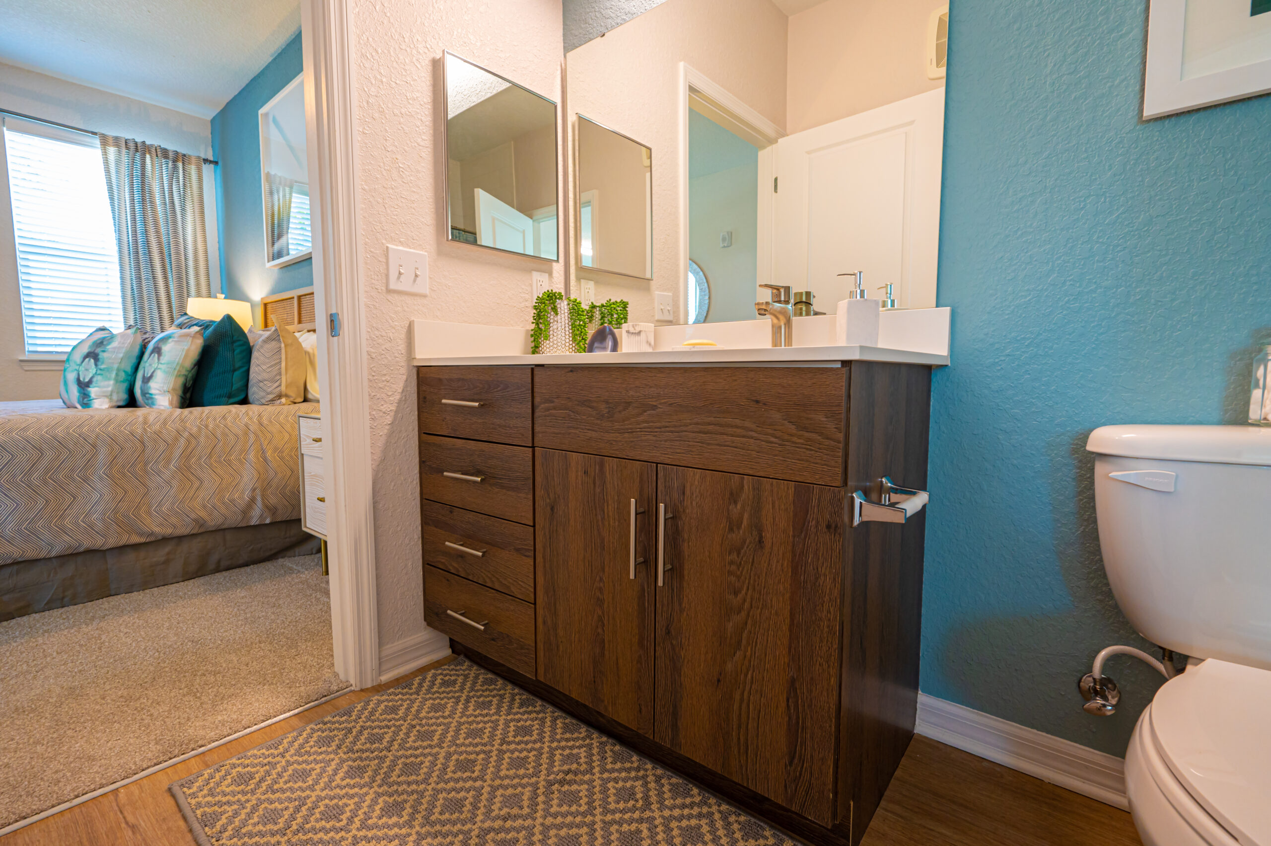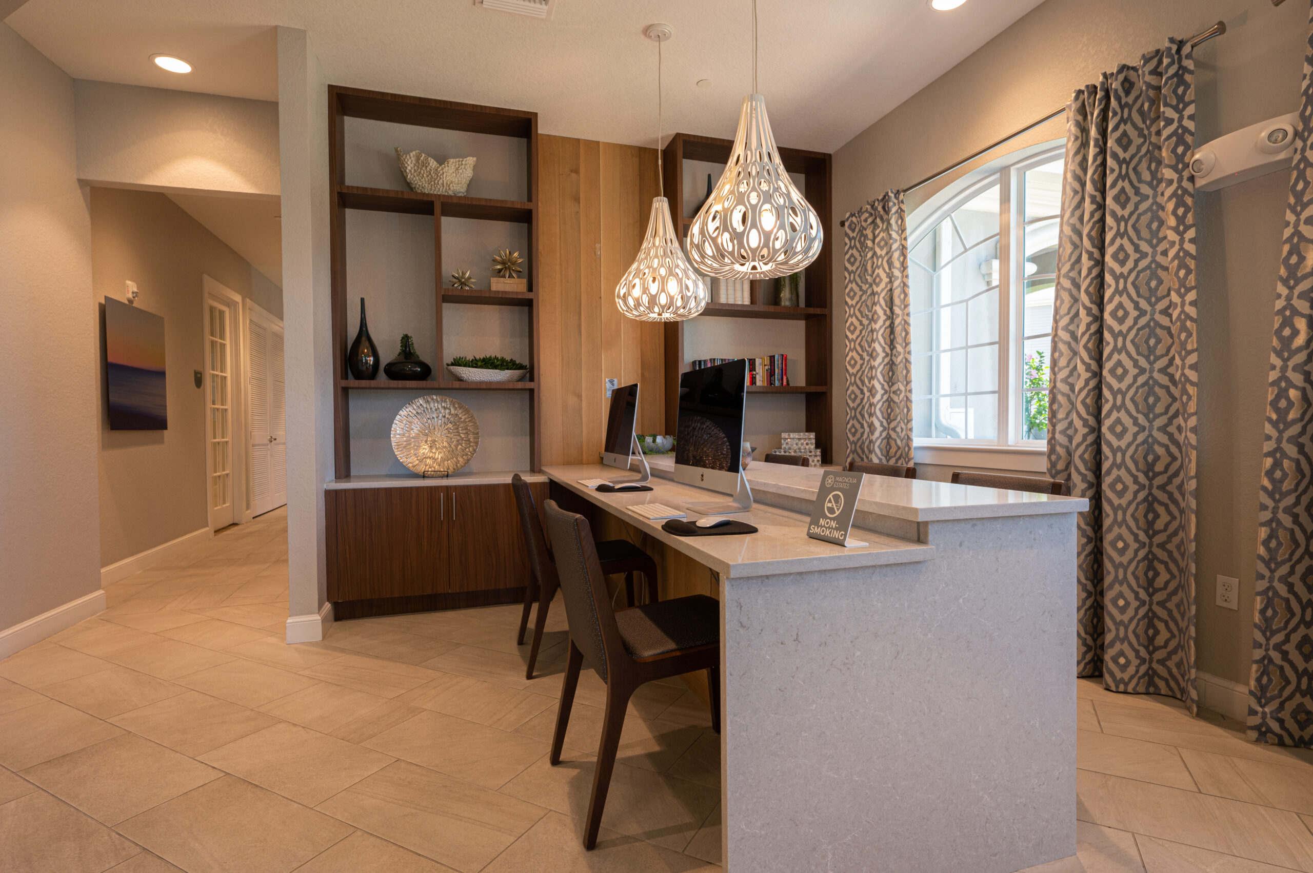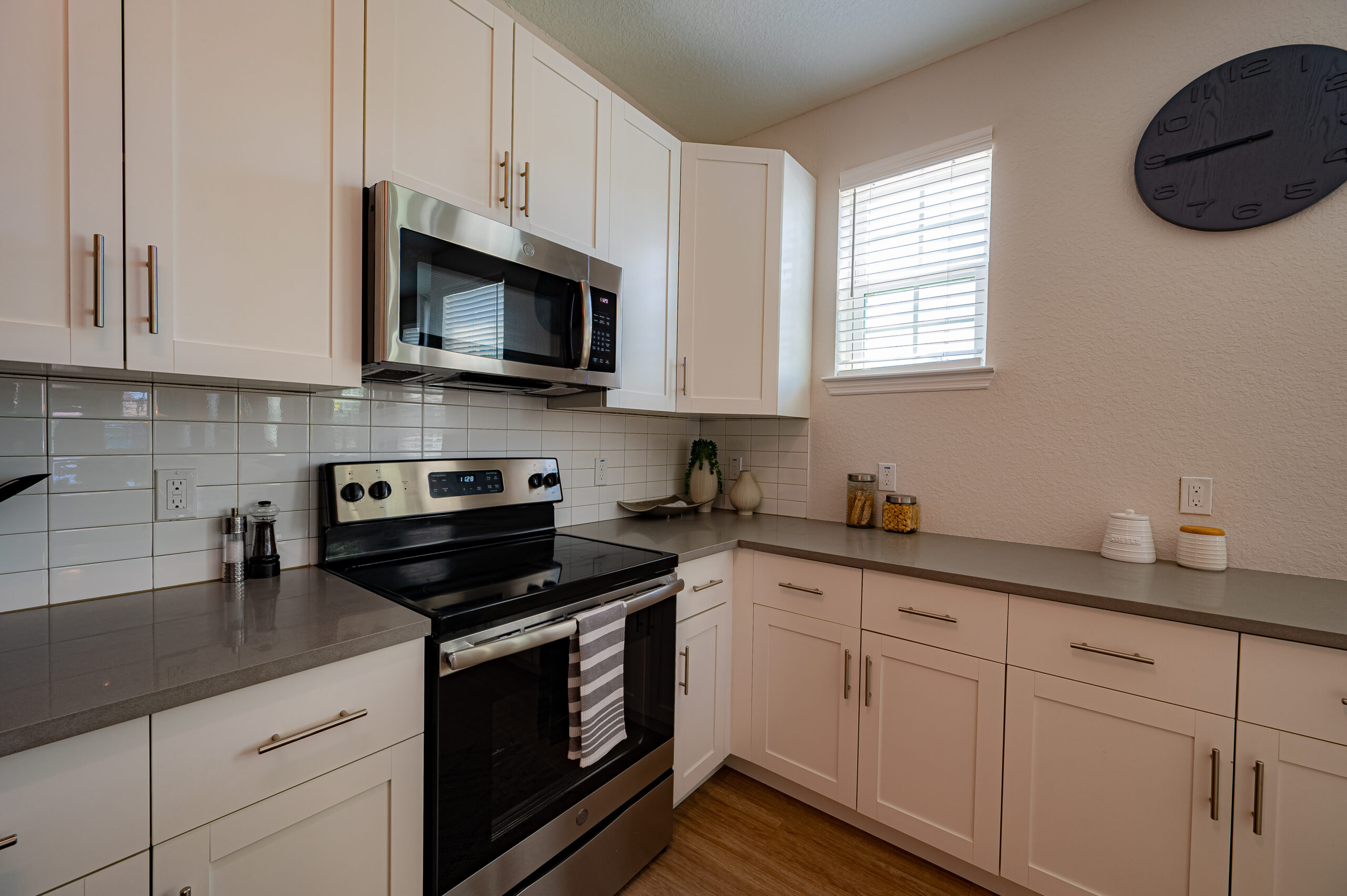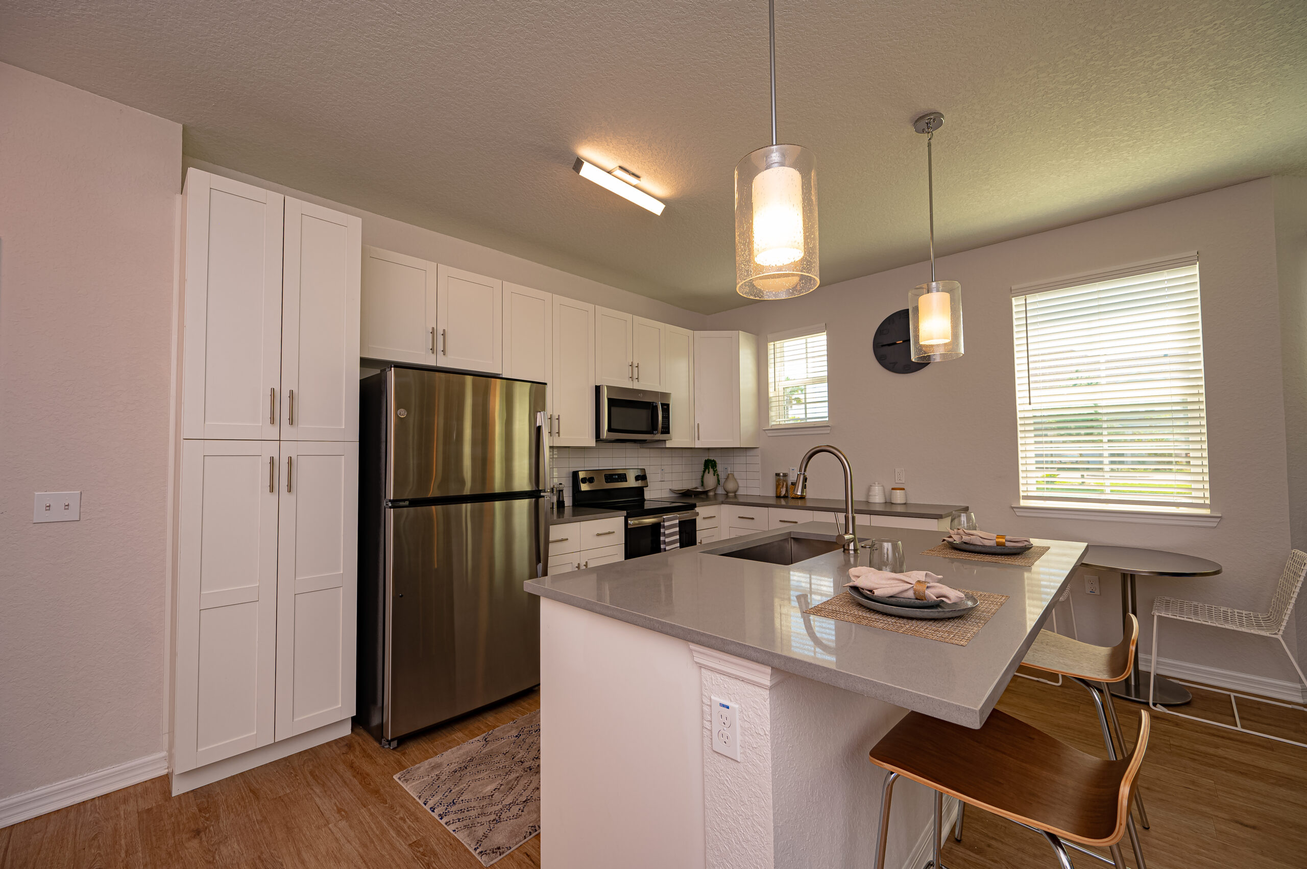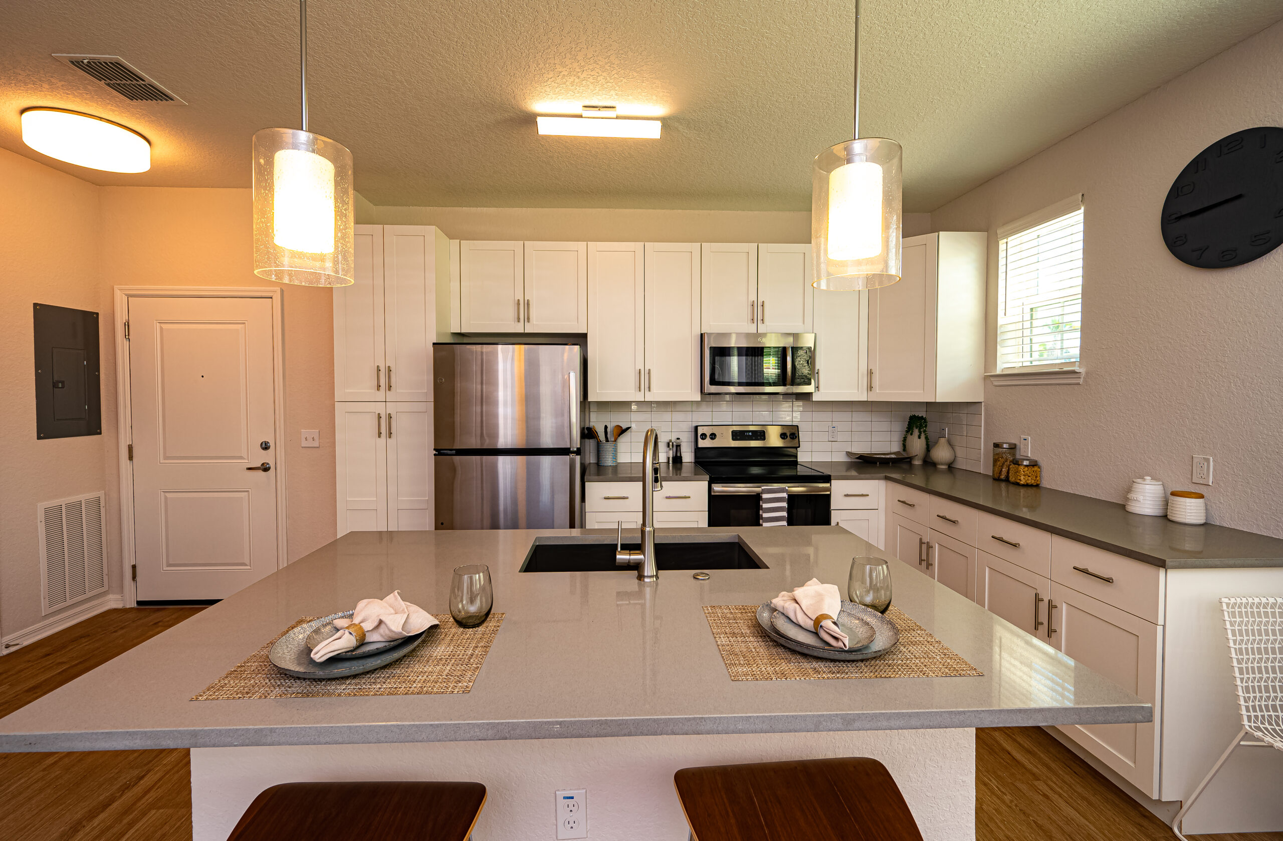 Kitchens and bathrooms feature quartz countertops in a neutral palette, selected for their durability, low maintenance, and consistent appearance throughout the community. The stone surfaces are paired with modern cabinetry and integrated sinks, delivering a cohesive, streamlined design that supports daily residential use while maintaining an upscale aesthetic.